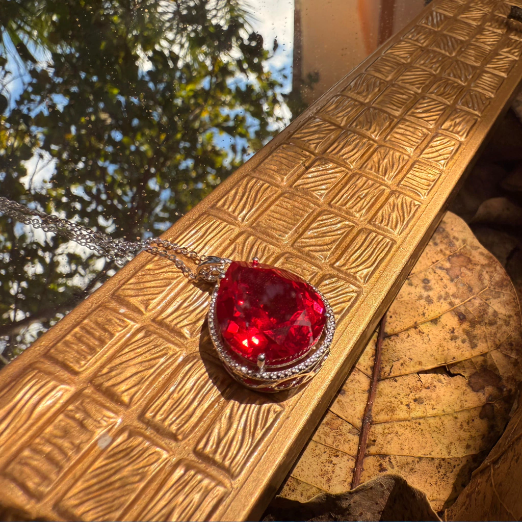 Colar em prata de lei com pingente em formato de gota, apresentando um deslumbrante Rubi de 8,85 quilates, verdadeiro e autêntico, com a mesma composição e durabilidade de pedras encontradas na natureza, mas por ser feita em laboratório torna-se mais acessível para a aquisição. Uma joia sofisticada, ética e acessível, que une intensidade de cor, elegância e brilho atemporal.