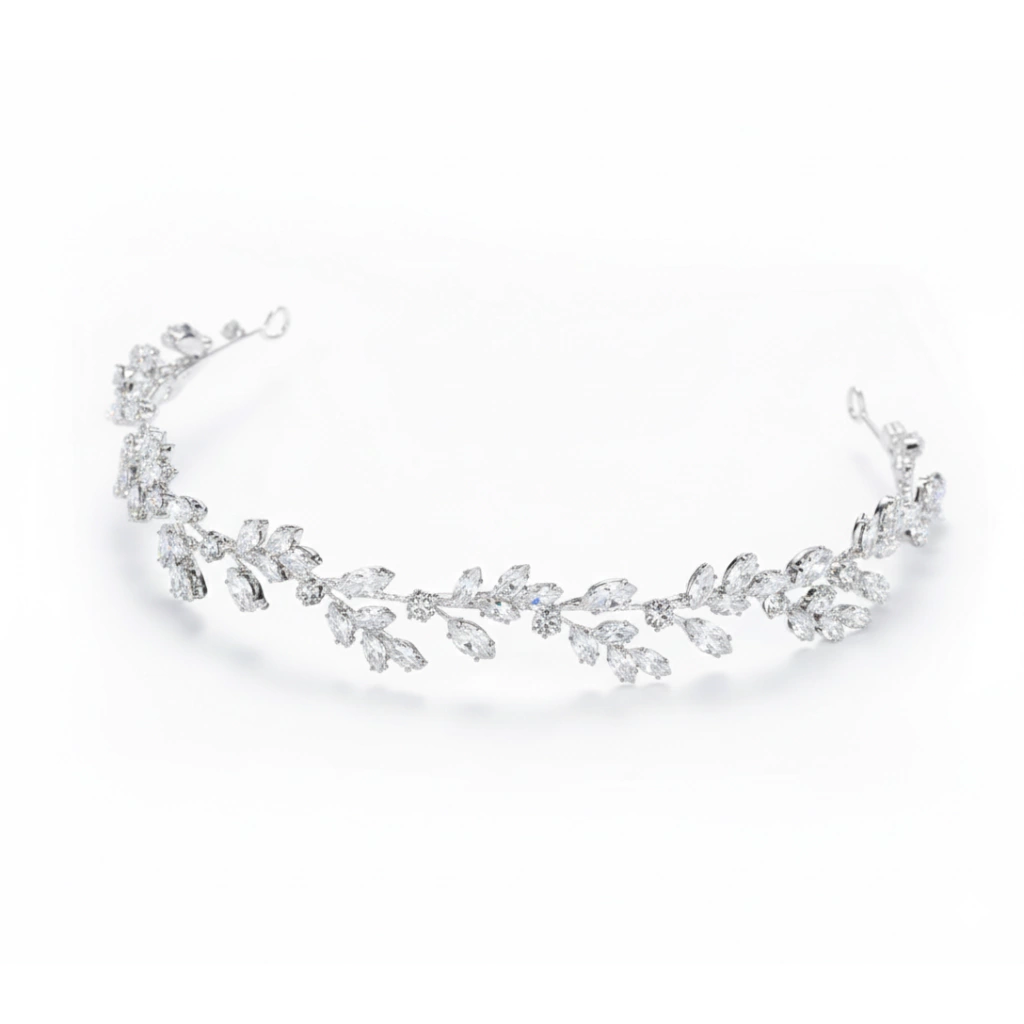 A tiara Flora é uma peça de luxo em prata com moissanitas, criada para quem busca um brilho sofisticado e atemporal. Seu design orgânico, inspirado em ramos e folhas, envolve a cabeça com uma elegância leve e etérea, enquanto as moissanitas em cortes marquise e pêra oferecem um brilho límpido que remete a joias de alta classe. Cada detalhe foi pensado para transmitir refinamento, desde a fluidez do desenho até o cintilar intenso das pedras, resultando em uma tiara que ilumina o rosto com delicadeza e exala charme, exclusividade e sofisticação absoluta.